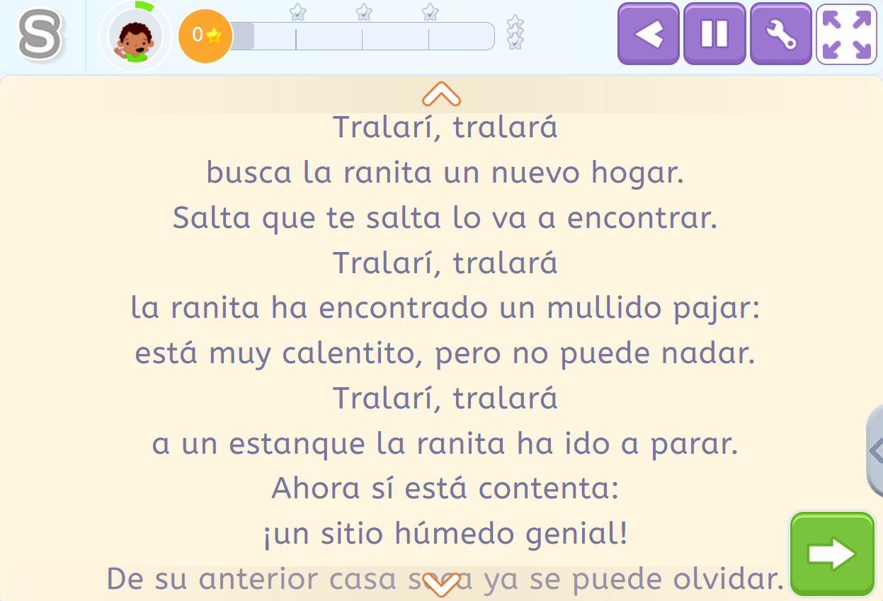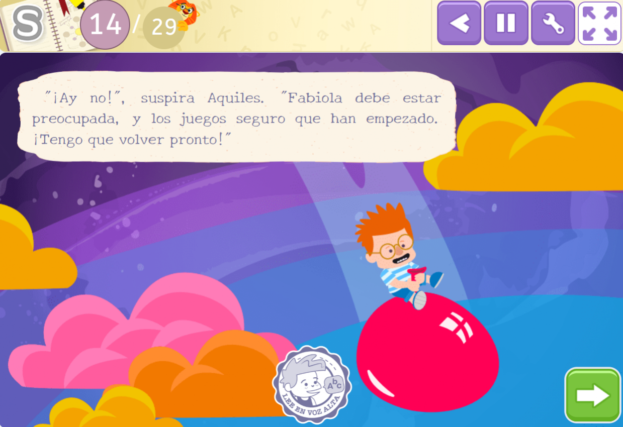 Poco a poco, se le va dando un papel más activo: se intercalan fragmentos locutados con otros que el niño debe leer en voz alta, favoreciendo así su participación y autonomía. Esta progresión está pensada para acompañar el desarrollo lector de forma natural, reforzando su confianza al enfrentarse a la lectura.