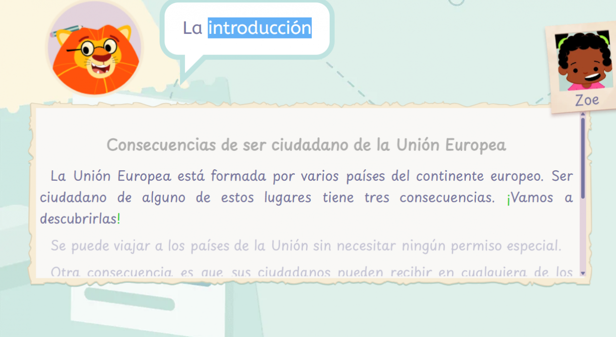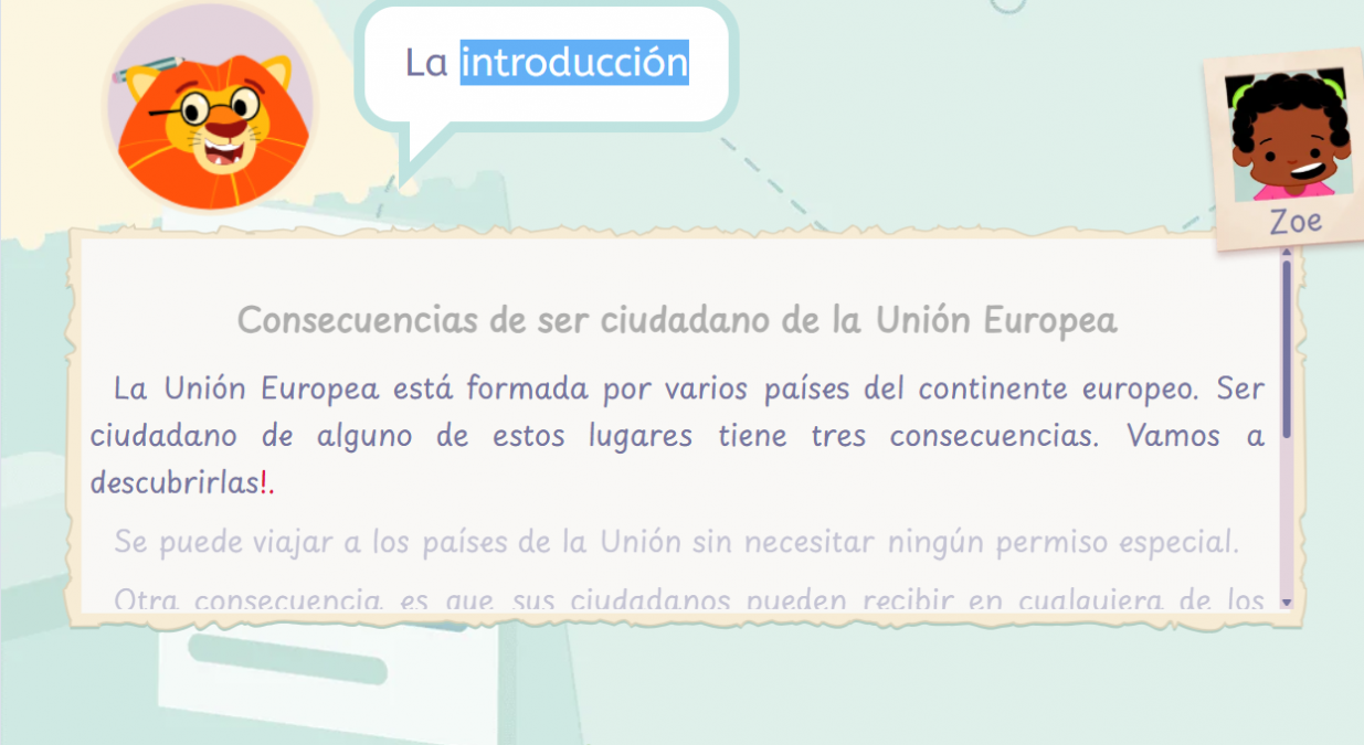 En este carrusel de imágenes puedes ver cómo funciona: el texto aparece sin los puntos correctos y los niños tienen que decidir dónde va cada uno. Así practican de forma real y en contexto, no de forma aislada. Leo el león les ayuda en estas sesiones y les explica paso a paso qué partes en la escritura se deben tener en cuenta para hacer una buena redacción.